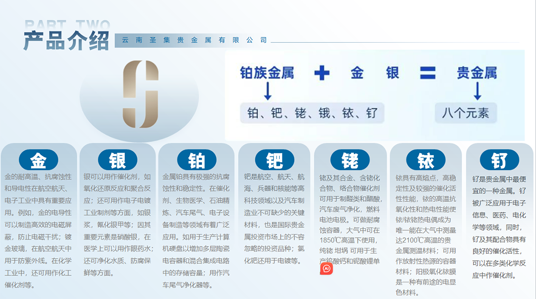 云南圣集贵金属有限公司(以下简称云南圣集)于 2018 年 4 月4日注册成立,注册资本为人民币伍佰万元。云南圣集是集贵金属产品研发、生产、销售于一体,以创新为驱动力的贵金属高科技公司,是一家专业从事贵金属产品贸易的平台型企业。主要贵金属产品包括:铂、钯、铑、铱、钌等,为上下游企业提供原材料、半成品以及下游产品的全产业链贸易服务。公司与多家知名贵金属公司、铂族金属生产企业保持长期稳定的合作,拥有广泛的产品线和完善的供应链体系。公司秉持“坚守信用,细心高效,勇于担当”的使命,将持续在贵金属领域深耕,将云南圣集打造成国内知名,有国际竞争力的贵金属高科技公司。